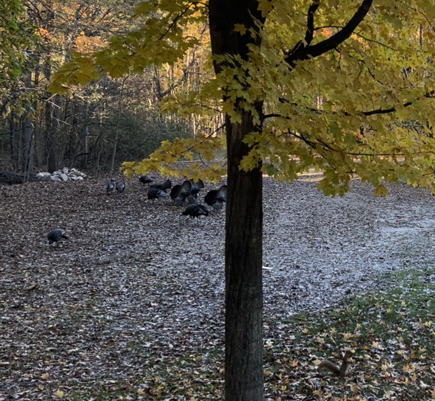 We live with a large community of Wild Turkeys. Over the last few months, we have watched four adult moms raising their combined eighteen children. During the summer it was much easier to see who the kids were but now that it is November, they are much closer in size to their moms making it more difficult to distinguish the young from the more mature. Watching them is like watching human moms with their kids, perhaps out for a field trip or maybe a group of home-schoolers. In this case, however, it is not an elective field trip but a beautiful and serious introduction to the young Turkeys’ “bigger world” in which they must learn to understand and live. Whenever they are traveling, the four moms space themselves so that one mom is in the lead, two moms are in the middle with the kids and one mom brings up the rear. We watched them one day come out of the woods, forage in the backyard, quite near the house — maybe 30 feet away. When the kids got too rambunctious or tried to wander off, one of the moms was right there to redirect them. We could see the love and caring those moms have for their kids. They walked slowly, deliberately looking for seeds and insects in the grass. They seemed very content.
